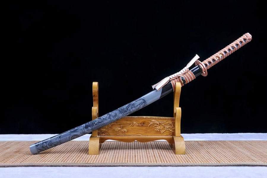 The Katana Auspicious T10 Clay Tempered Blue Saya is an exceptional samurai sword, crafted using a unique clay tempering process that provides superior strength and resilience. Its “Auspicious” design offers a perfect balance of sharpness and lightness. Featuring a blue saya, this katana is built with an added layer of durability, making it ideal for martial arts practitioners. The handmade full-function Katana Sword is 103 cm in length, with a full tang blade made of T10 clay tempered steel, complemented by a hardwood saya and brass fittings. The swordsmith carefully polished and sharpened the blade, making it a stunning display piece. Sword holder or stand sold separately. Katana T10 Clay Tempered Steel Blade Japanese Samurai Sword Auspicious Tsuba Handmade Wood Saya