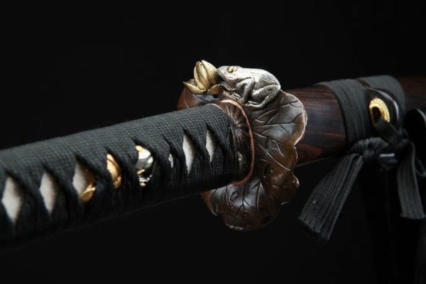 This Katana Frog Lotus Damascus Folded Clay Tempered Ebony Sword is a remarkable example of fine craftsmanship. Constructed from premium materials, it features an ebony saya and clay tempered Damascus steel, ensuring both strength and durability. The result is a stunning piece that balances aesthetic appeal with practical performance.
