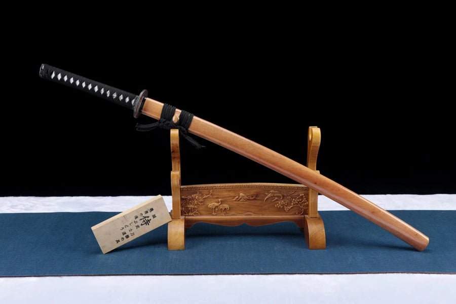 The handmade full-function katana measures 103 cm in length. It features a full-tang T10 clay-tempered steel blade, paired with a hardwood saya and alloy fittings. Each blade is meticulously polished and sharpened by our skilled swordsmith, making this piece not only a functional weapon but also a stunning item for display. Sword holder or stand sold separately.