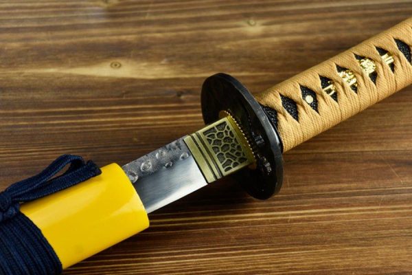 The sword’s distinctive yellow saya is adorned with intricate floral artwork, adding a touch of artistic beauty to its overall design. The combination of hardwood saya and alloy and iron fittings enhances the katana’s aesthetic appeal while maintaining its traditional essence.