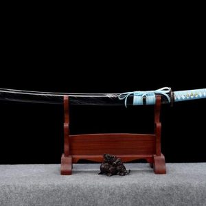 This handmade katana measures 103 cm in length and features a full tang carbon steel blade, ensuring robustness and reliability. The hardwood saya and alloy fittings add to its sophisticated appearance. Expert swordsmiths have meticulously polished and sharpened the blade, making it suitable for both display and practical use. Note that a sword holder or stand is available separately to showcase this exquisite piece properly.