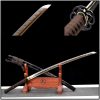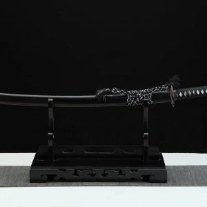 The handmade full-function Katana Sword is 103 cm in length with Real Hamon and Real Ray Skin. The Full Tang blade is made of Damascus Folded Steel, clay-tempered, with an Ebony Wood Saya and Ox Horn fittings. The swordsmith carefully polished and sharpened the blade, making it not just a beautiful display piece. Sword holder or stand sold separately.