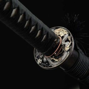 This Katana Rozan Dragon is an extraordinary sword, crafted with great precision from layered damascus steel and clay-tempered for maximum durability and enhanced edge retention. The fine Ebony saya, adorned with a dragon motif, completes the stunning design.