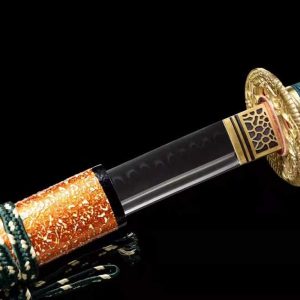 This premium Katana Tianming T10 Clay Tempered Orange Saya is crafted with a high-quality 1095 high-carbon steel blade hardened to a Rockwell C rating of 60. This traditional samurai sword is further honed and clay tempered with a deep groove and features an elegant orange saya lacquered with a rust-resistant protective coating.